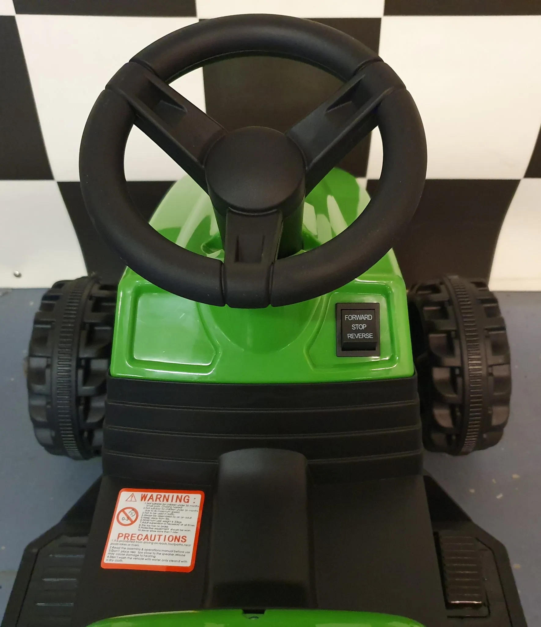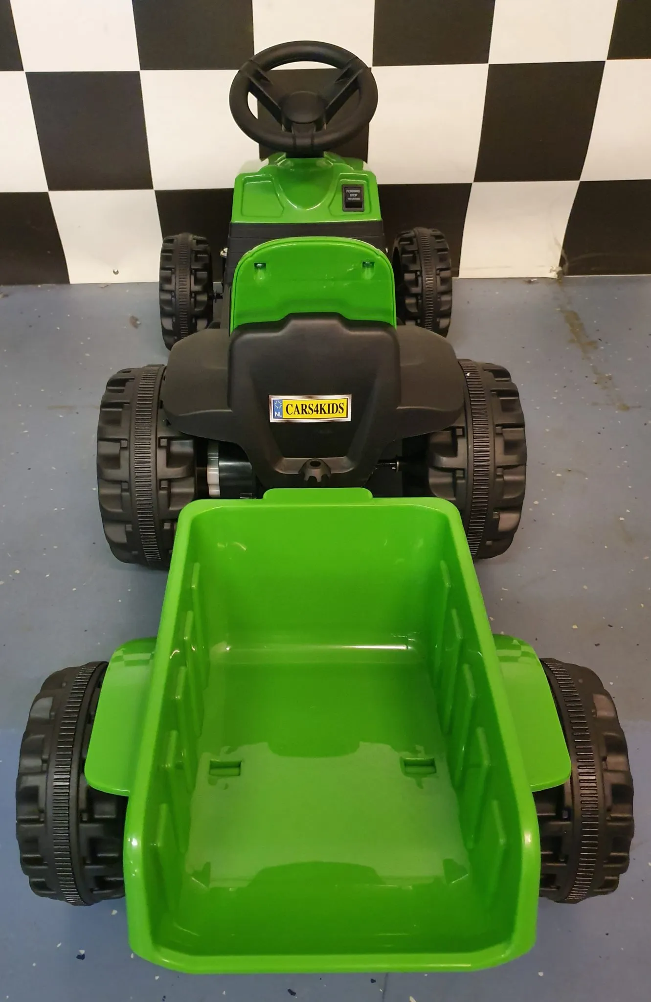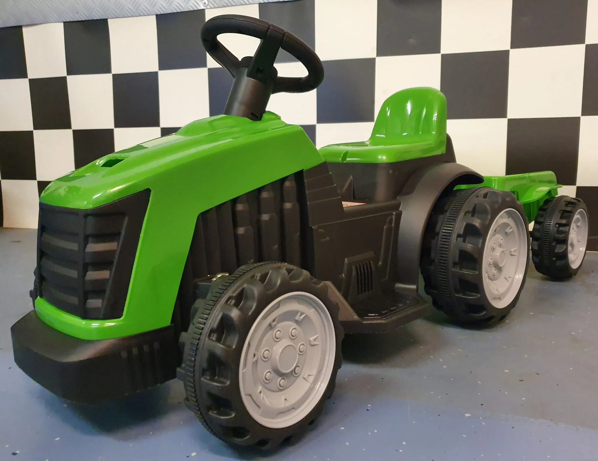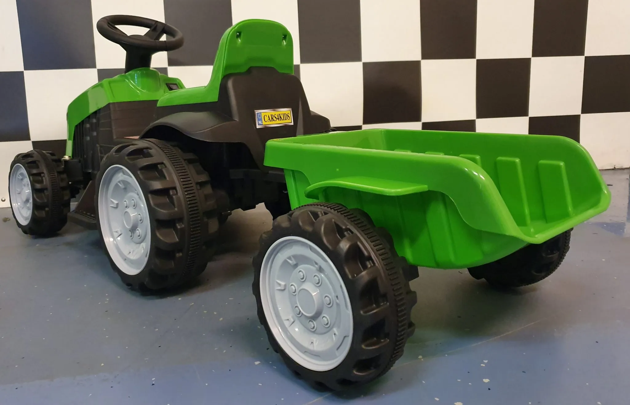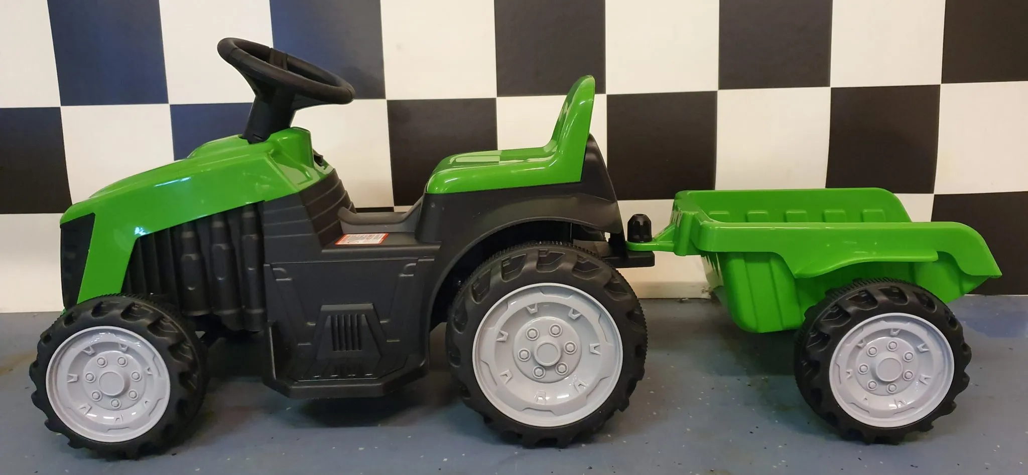 Den elektriske børnetraktor 6 V i grøn er en enkel og sjov lille el‑traktor, der er ideel til yngre børn fra omkring 1,5 år (altid under opsyn) og op til ca. 4 år. Den er udstyret med en 6 V batteripakke og en motor, som giver en moderat kørehastighed på omkring 2,5‑3 km/t, så barnet kan køre sikkert rundt både indenfor og udenfor. Traktoren kan køre fremad og bagud via en simpel gear‑/kontaktfunktion og har en aftagelig trailer, som gør legen endnu mere underholdende og realistisk. Den er robust bygget med god plads til små førere og har automatisk bremse for ekstra sikkerhed. Med sit klassiske grønne design og legevognsfunktioner giver denne elektriske traktor mange timers aktiv leg og er perfekt som introduktion til elektriske køretøjer for de alleryngste.