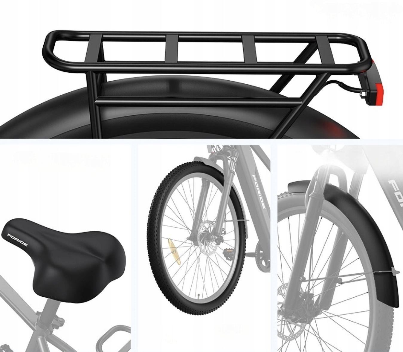 1 x oplader, 1 x batteri, 1x for- og bagskærm, 1 x bagagebærer, 1 x engelsk brugermanual.