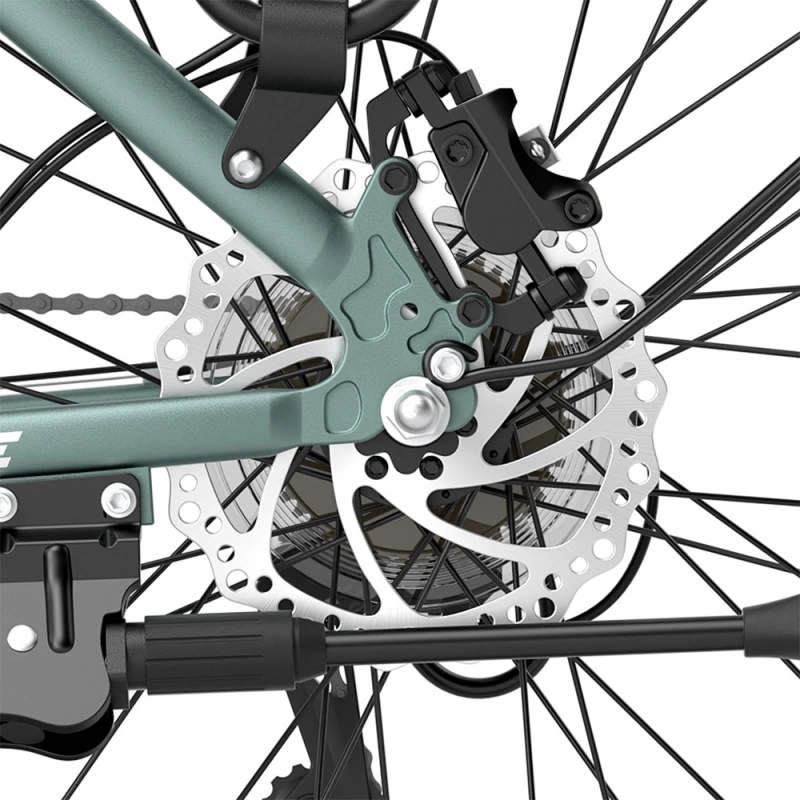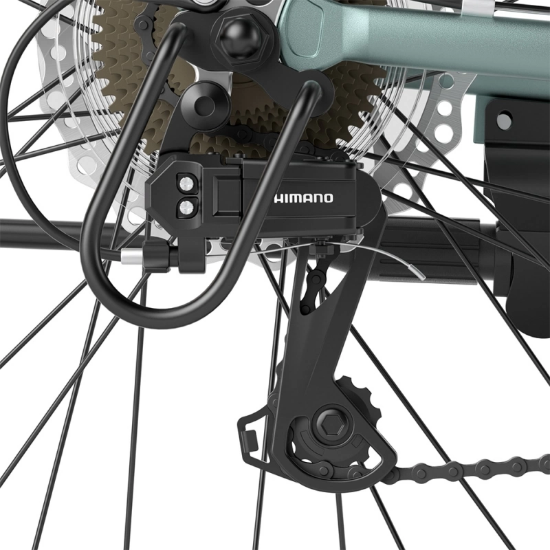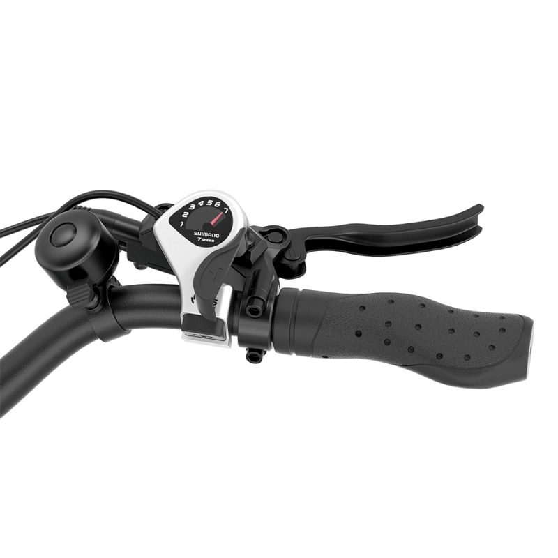 Gearsystemet er Shimano 7-speed, som sikrer jævnt og pålideligt gearskifte. De hydrauliske skivebremser for og bag med 160 mm skiver giver effektiv og sikker nedbremsning – selv i regn og på glatte underlag.