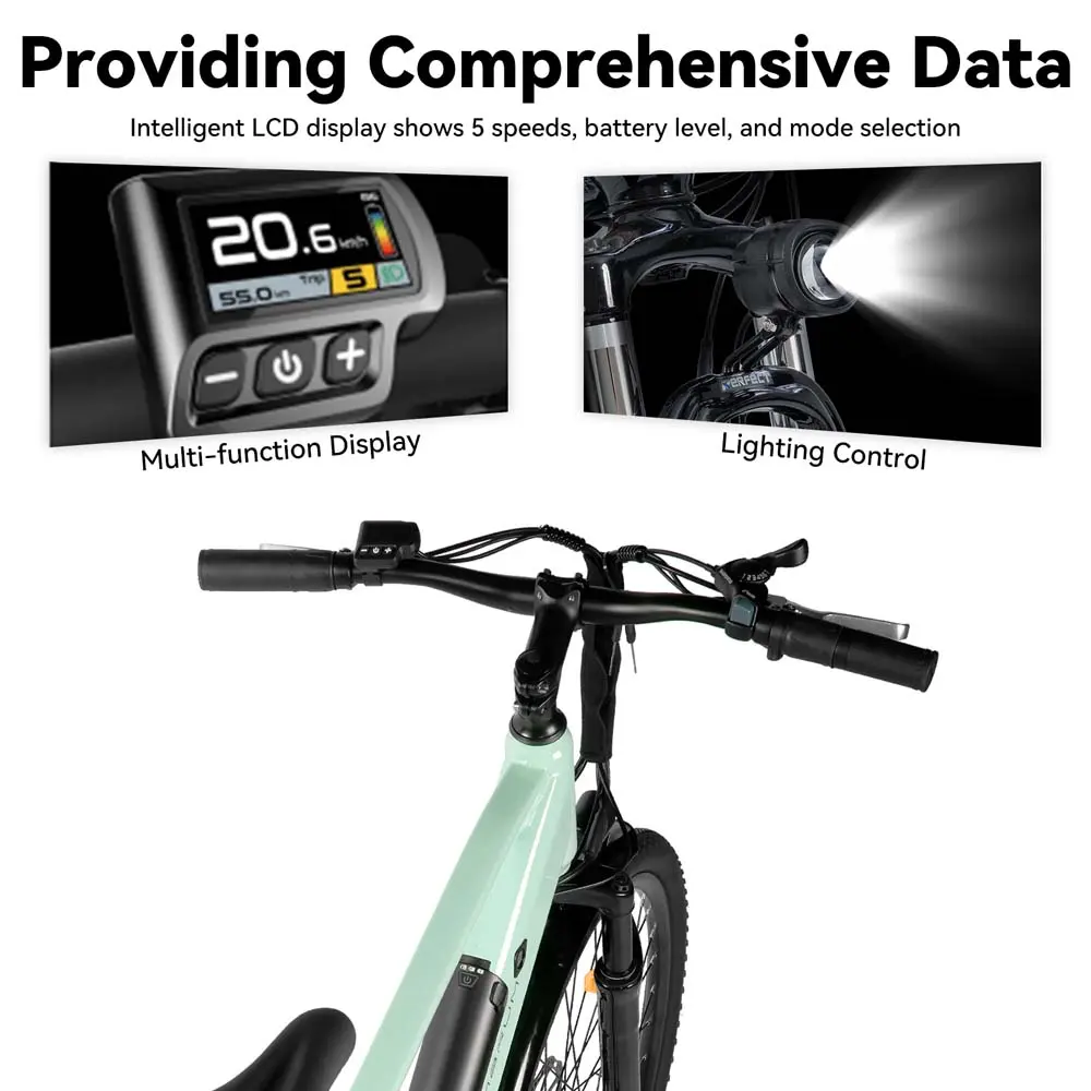 El cyklen har mekaniske skivebremser for og bag, hvilket sikrer stabil og kontrolleret nedbremsning i varierende forhold. Gearsystemet er et 7-gear transmissionssystem fra Shimano – hvilket gør den velegnet til by- og let terrænbrug. Du får et mindre LCD-display, der viser viser hastighed, batteriniveau og assistanceniveau, så du har overblikket på din tur.