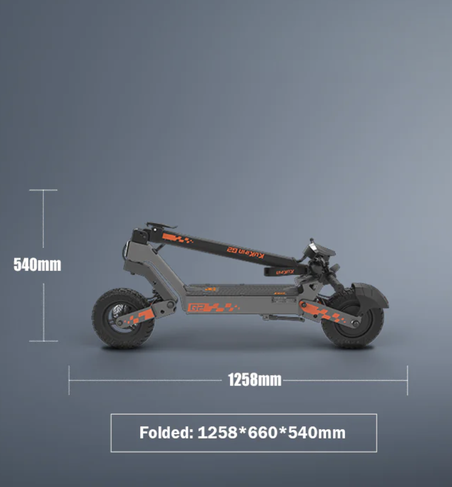 KuKirin G2 er udstyret med en 15ah lithium batteri, der giver op til 50 km på en fuld opladning. Motoren kan klare bakker med en stigning på op til 20°.