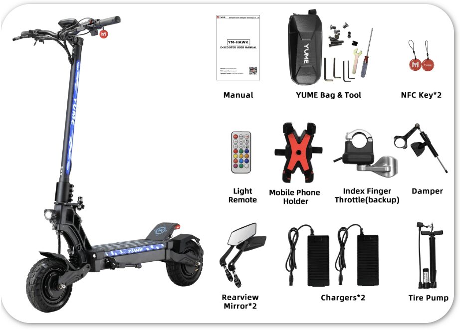 1 x oplader, 1 x batteri, 2 x NFC kort, 1 x fjernbetjening til lys, 1 x mobilholder, 1 x tommelfinger-gas (reserve), 1 x front taske, 1 x værktøjs multitool, 2 x sidespejle, 1 x luftpumpe og 1 x engelsk brugermanual.